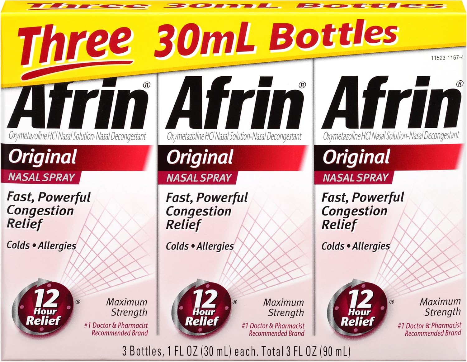 Non-addictive saline nasal sprays have no. You can spray an over-the-counter decongestant spray such as oxymetazoline Afrin Dristan Neo-Synephrine Vicks Sinex others into the bleeding side of the nose and then apply pressure to the nose as described above. But if your nasal passages are too dry then sinus pain nose bleeds sinusitis and other troublesome conditions can develop. Repeat up to 4 times a day if needed. Used too often however Afrin can lead to rebound congestion that can make your nose feel stuffy. Thats why we developed the Complete Guide to Best Nasal Sprays. Unlike Flonase and Nasacort Afrin is for temporary relief of symptoms. What You Should Know. Afrin Nasal Spray contains oxymetazoline a compound that constricts blood vessels.