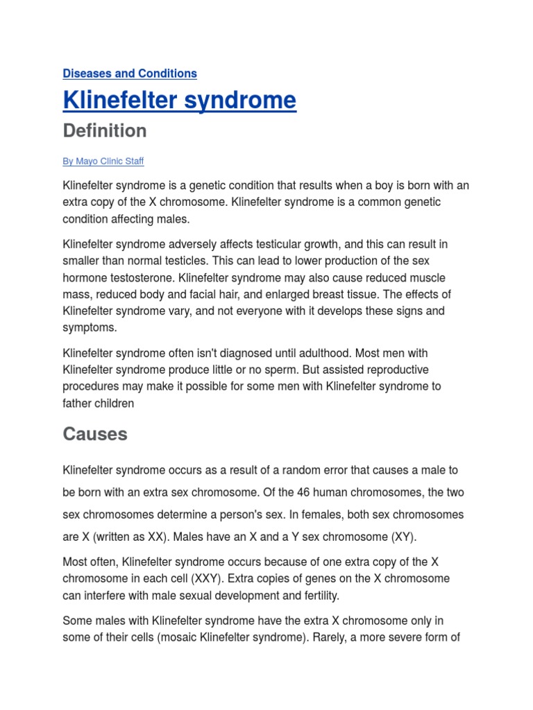 Klinefelter syndrome is a chromosomal condition in boys and men that can affect physical and intellectual development. Klinefelter syndrome 47XXY. An extra X chromosome in some of the cells mosaic Klinefelter syndrome with fewer symptoms More than one extra copy of the X chromosome which is rare and results in a severe form Extra copies of genes on the X chromosome can interfere with male sexual development and fertility.
