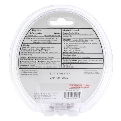Target cold sore treatment. COLD SORE FEVER BLISTER TREATMENT- docosanol cream TARGET Corporation-----Docosanol Cream 10 Active ingredient Docosanol 10 Purpose Cold sorefever blister treatment Uses treats cold soresfever blisters on the face or lips shortens healing time and duration of symptoms. Put a scarf over your mouth to protect against freezing temperatures. Cold Sore Prevention Advice Tips Apply a zinc oxide lip balm or sunscreen SPF 30 to block ultraviolet sun rays.