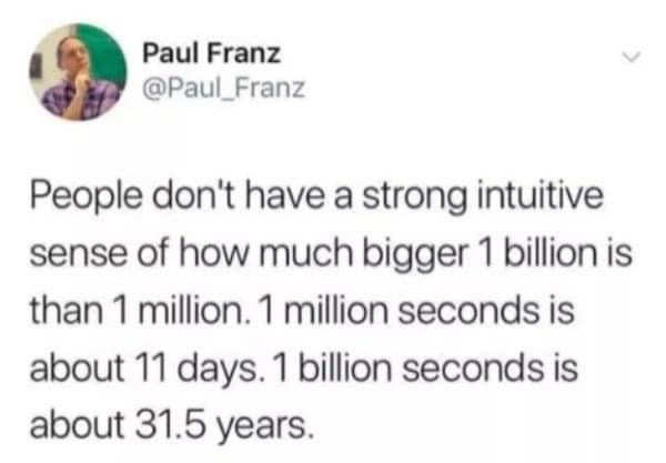 How long ago is 1million seconds. Or around 315 quadrillion seconds. A trillion seconds is 31688 years.
